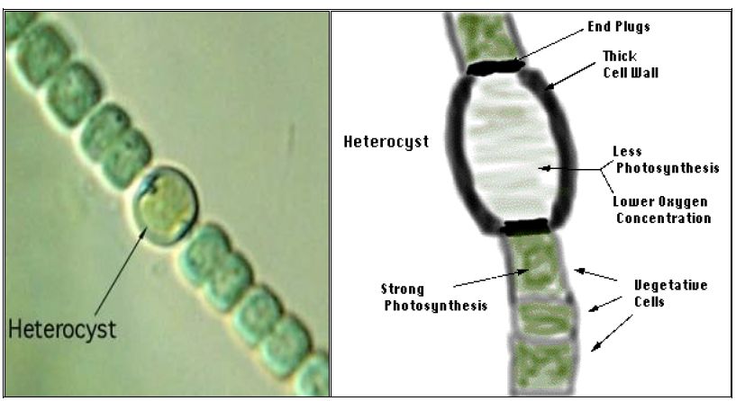 وداخل هذه التراكيب أو الأكياس المتخصصة يتم تثبيت الهيدروجين في جنس الطحالب الصغيرة مثل Anabaena.