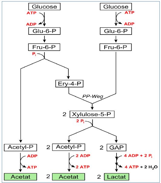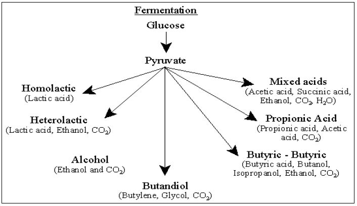 التخمرات التي تؤدي إلى إنتاج أكثر من مادة كما في حالة إنتاج حامض اللبن والكحول الاثيلي وثنائي أوكسيد الكاربون من قبل بعض بكتريا حامض اللبن مقابل إنتاج حامض اللبن من أنواع أخرى كما موضح في الشكل الآتي :