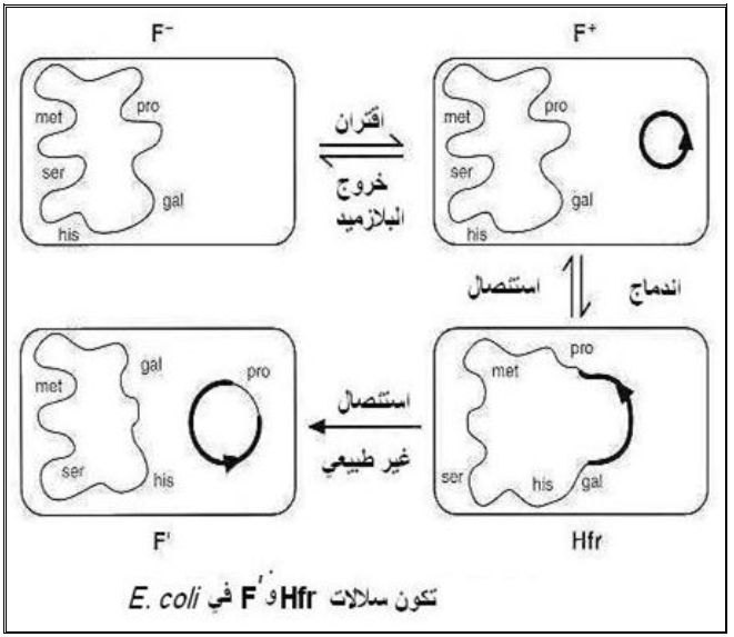 وعند حصول استئصال غير طبيعي للبلازميد F فانه يكون F' plasmid الذي يحوي جزءا من كروموسوم الخلية كما موضح في الشكل ويمكن ان تحدث الحالة العكس اذ يمكن ان تبقى بعض الجينات البلازميدية في كروموسوم الخلية كما يحصل مع بلازميد المقاومة R plasmid وينتج R' . ان سلالات Hfr تستطيع ان تنقل كروموسوم الخلية الى الخلايا المستلمة بكفاءة عالية ونقل شريط مفرد من الخلايا Hfr الى خلايا مستلمة يبدأ من منطقة اصل تضاعف البلازميد ويستمر الى النهاية أي يتم نقل جريئة كبيرة من الحلقة الهجينة المكونة من كروموسوم الخلية والبلازميد وعملية النقل الكاملة تحتاج الى حوالي 100 دقيقة . ومن التحري عن اول الجينات الكروموسومية التي تنقل وقطبية انتقال الكروموسوم يمكن تحديد موقع اندماج البلازميد وترتيبه بالنسبة للكروموسوم . ومن تحليلر الارتباط الكمي أمكن وضع الخرائط الكروموسومية الجينية والخرائط الطبيعية التي تستعمل في تحليل العناصر غيرالكروموسومية مثل البلازميدات والعاثيات . واهم الطرق المستعملة في ذلك هي عملية الاقتران وذلك لان الخلايا المقترنة يمكن ان تنفصل تلقائيا بعد مدة لذا ينقل جزء من كروموسوم الخلية الواهبة ، وفي المدة الأولى يكون من غير المحتمل نقل الجينات بعيدة عن نقطة الاصل ، كما ان ايقاف التزاوج يمكن ان يحدث عمليا وذلك برج الخلايا بشدة وبأوقات يتم اختيارها . ومن تحليل صفات الافراد الناتجة وتحديد تعبيرها عن جينات الخلايا الواهبة بالتتابع الزمني يمكن رسم الخرائط الكروموسومية . ويكون من المفيد ان تجري عملية الاقتران بين سلالات Hfr مع خلايا- F ، لان اقتران +F مع -F ينتقل البلازميد فقط والذي ينتشر في المجموع البكتري .