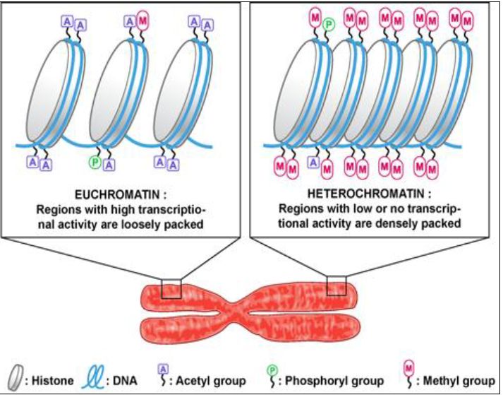 وبذا تعد أحد أوجه التنظيم اللاوراثي اي غير المتعلق بتواليات DNA ، فالهستونات يمكن ان تنشط الجينات او تسكتها وهذا يوضح لماذا تتمايز وتتخصص الخلايا. وأشرطة DNA تلتف حول الهستونات بشكل خاص حول مراكزالهستونات كما موضح في الشكل :