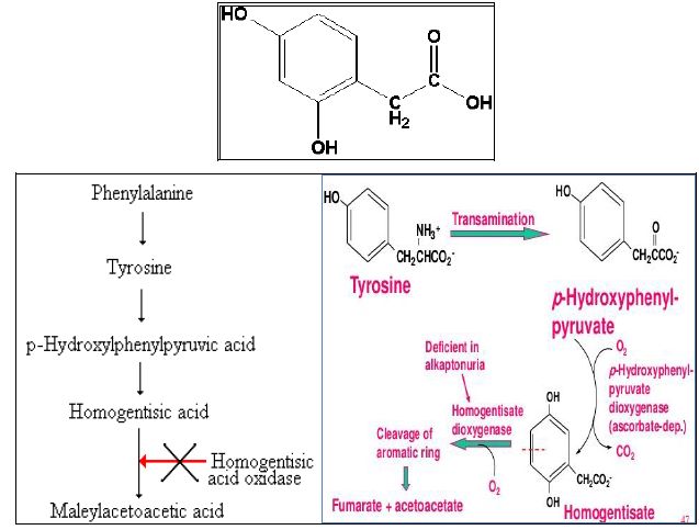 مركب وسطي ينتج من ايض التايروسين و Phenylalanine ، يوجد بمستويات مرتفعة في الاشخاص المصابين ب Alkaptonuria.