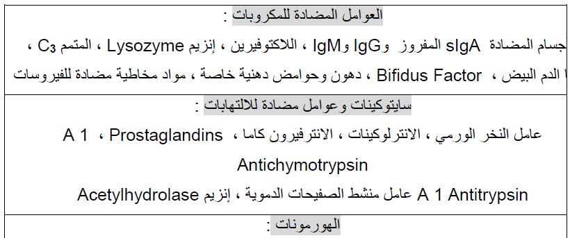 عوامل مختلفة الفئات توجد في حليب الأم خاصة في الأيام الأولى عند إدرار اللبأ Colostrum وبعد الولادة يستمر حليب الأم بحماية الوليد ومن أهم العوامل: