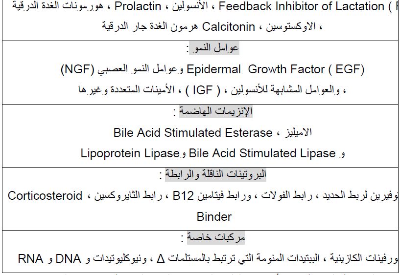 - الميوسين Mucin ويقوم البروتين بالارتباط المباشر بالبكتريا E. coli وطرحها الى الخارج ، وكذلك Lactadherin الذي يرتبط بالفيروسات العجلية Rotaviruses .