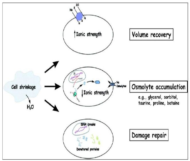 وتتفاعل الكائنات وحيدات الخلايا مع هذه الظرف للتعويض عن الماء المفقود بتخليق التنافذيات العضوية داخل الخلايا وهذا يعني تحفيز مسارات معينة داخل الخلية ، ففي الطحالب تتحفز الخلايا لتكوين الكليسرول وفي الخمائر ايضا يتحفز مسار HOG لتخليق الكليسرول .