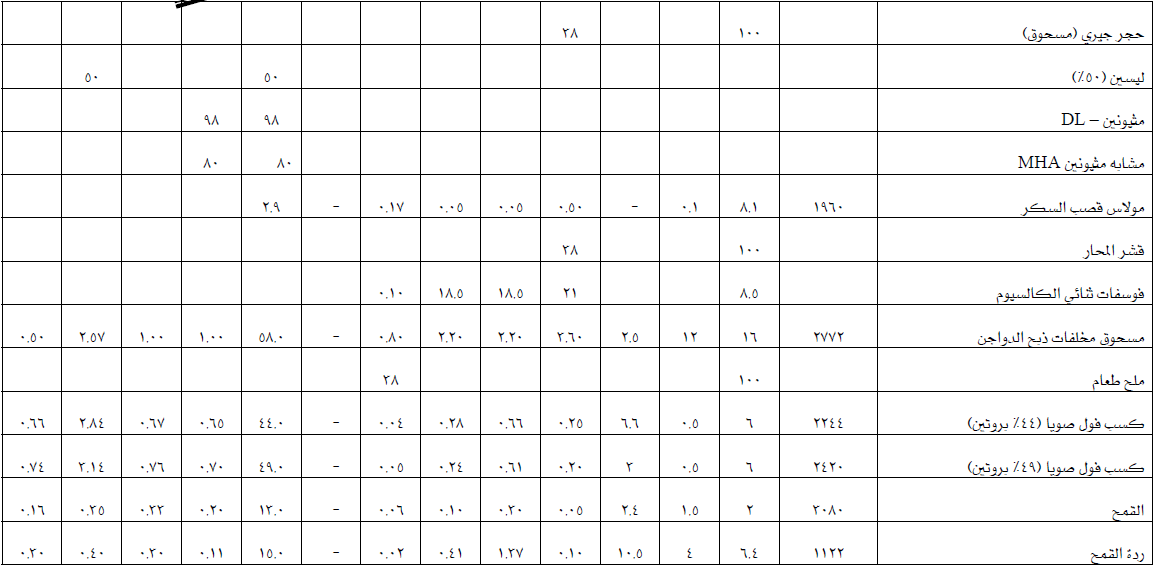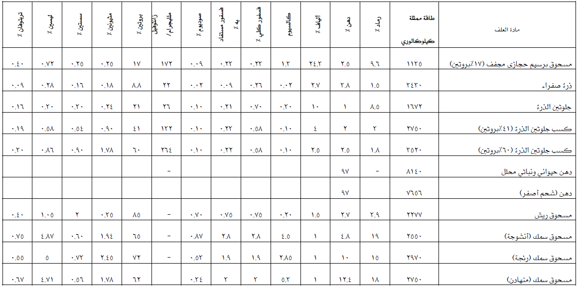 جدول رقم (3) التحليل الكيماوي لمواد العلف الشائع استعمالها في علائق الدواجن