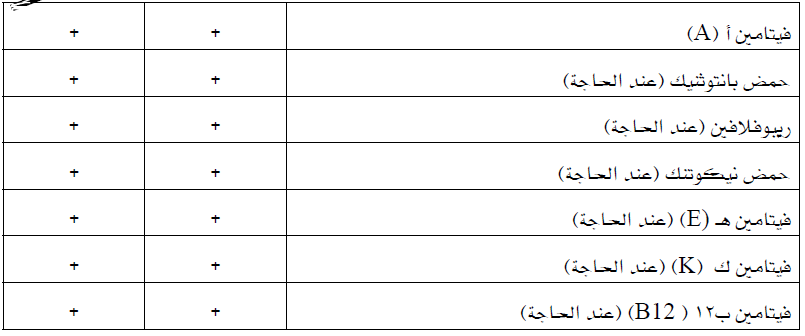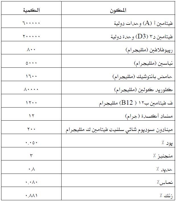 جدول رقم (2) تركيب المركز المخفف (البريمكس) للفيتامينات والاملاح المعدنية المبين بالجدول السابق