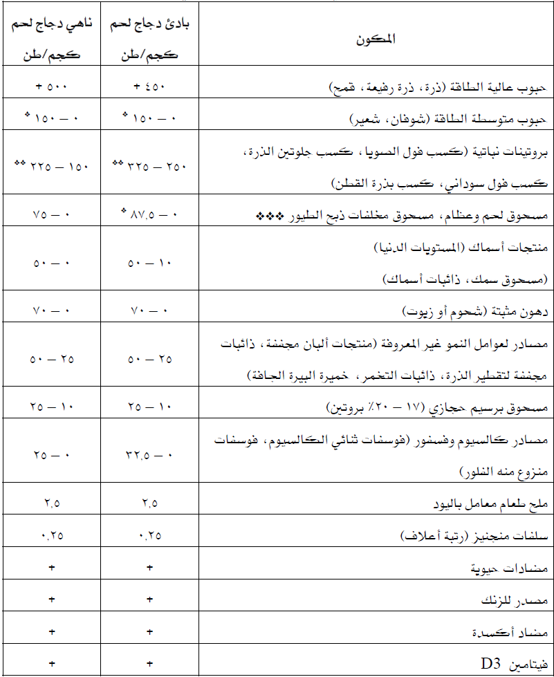 جدول رقم (1) المعدلات التي يوصى بها من مكونات الاعلاف في علائق دجاج اللحم