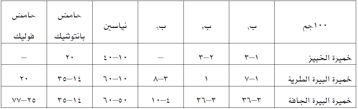 كمية الفيتامينات الموجودة في ۱۰۰جم خميرة (بالمليجرام)
