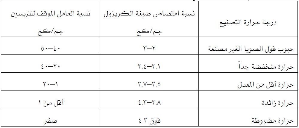 وتجرى لذلك اختبار صبغة الكريزول الحمراء Gresol Red لاختبار كفاءة كسب فول الصويا الناتج حيث أن صبغة الكريزول الحمراء تظهر بمعدل في حدود 4 جرام في كل كيلو جرام من الكسب الجيد التصنيع كما ووجد أن نسبة العامل الموقف العمل التربسين ينخفض أقل من اجرام في كل كيلو جرام طبقا للجدول التالي: