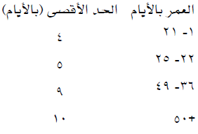 الحد الأقصى للأيام التي يتم تثبيت كمية العلف بها تبعا للعمر
