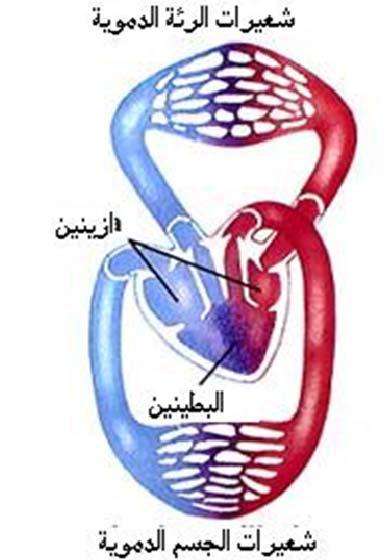 شكل رقم (3) الدورة الرئوية ( الصغرى ) من القلب الى الرئتين والعكس والدورة الجهازية (الكبرى) من القلب الى سائر اجزاء الجسم والعكس.