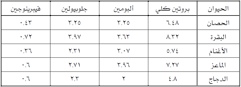جدول رقم (2) النسبة المئوية للبروتين الكلي والألبومين والجلوبيولين في بلازما بعض الحيوانات المزرعية (جرام/100 ملل بلازما)
