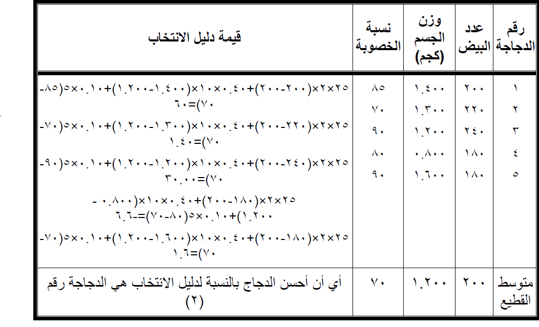 يوضح الجدول التالي طريقة حساب دليل الانتخاب لعدد خمس دجاجات يرغب المربي في المفاضلة بينهما لانتخاب أحسنها للتربية وذلك على أساس صفات عدد البيض ووزن الجسم ونسبة الخصوبة في بيض التفريخ ، علما بأن معامل التوريث لهذه الصفات على الترتيب هو 0.25 ، 0.40 ، 0.10 ، أما بقية القيمة النقدية لهذه الصفات فقد قدرت بسعر ۲ ريال لبيضة التفريخ وبسعر 10 ريال للكيلوجرام من وزن الجسم وبسعر 5 ريال لكل 1% من نسبة الخصوبة في البيض.