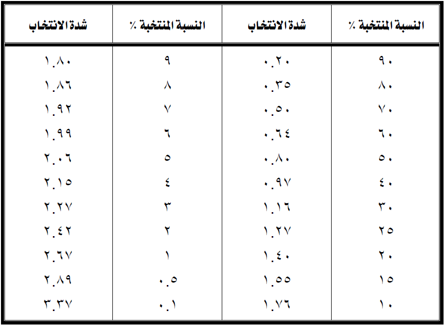 جدول يبين العلاقة بين نسبة الأفراد المنتخبة وشدة الانتخاب