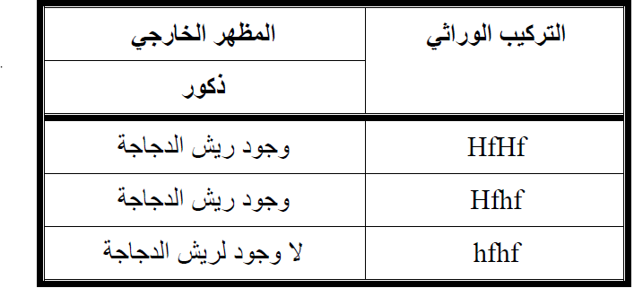 جدول يبين التراكيب الوراثية لظاهرة وجود ريش الدجاجة في الذكر المتأثرة بالجنس