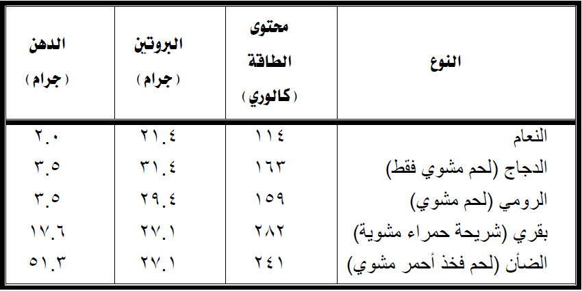 وفيما يلي التركيب الكيماوي للحوم النعام ومقارنتها بلحوم الطيور والحيوانات الاخرى: