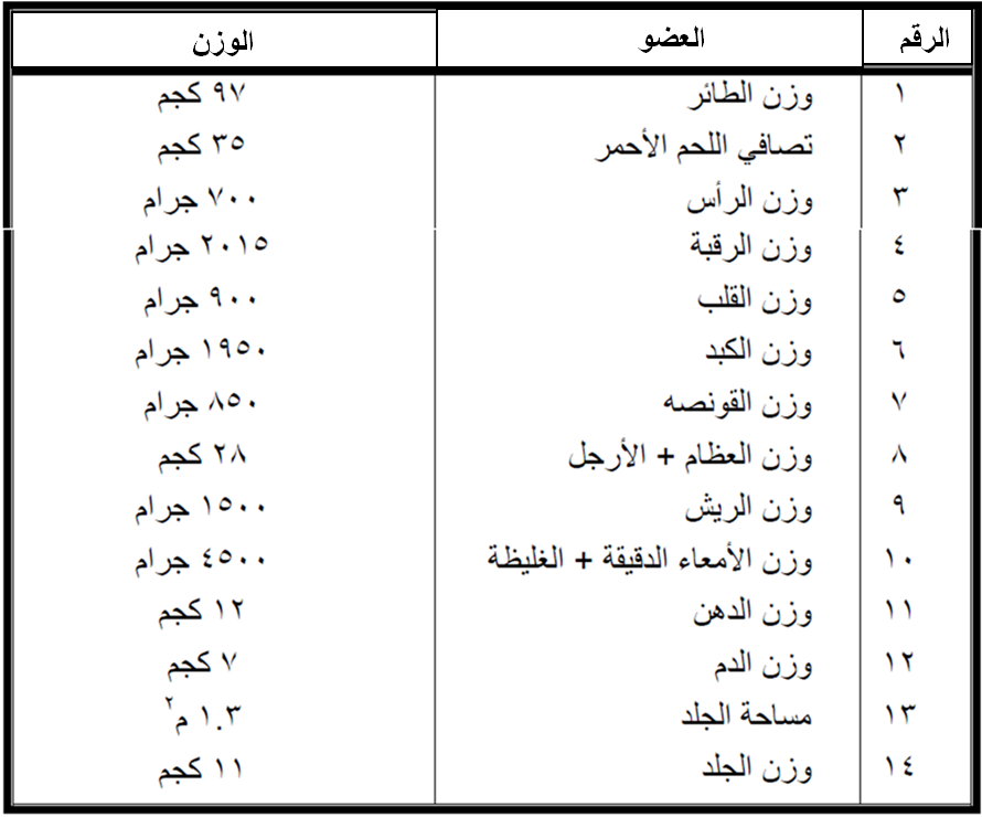 24. كمية الناتج من اللحم حوالي 35 – 45 كيلوجرام أي تصل نسبة التصافي حوالي 50% 5 ، 1.5 متر مربع من الجلد، واحد كيلوجرام من الريش.