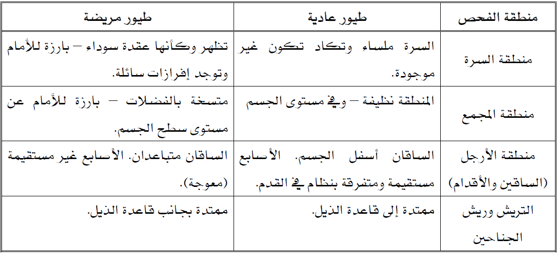 وفيما يلي جدول مبسط للمقارنة بين الطيور العادية والتي تتمتع بصحة وحيوية جيدة والطيور غير العادية.