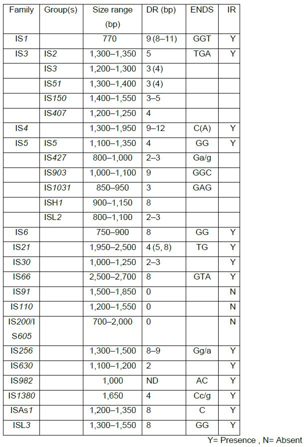 تواليات يصل طولها الى اقل من 2.5 كيلو قاعدة من DNA وهي قصيرة يمكن ان تعمل كعناصر قافزة بسيطة ، توجد في كروموسومات البكتريا او في البلازميدات او العاثيات ، ويكمن ان تتحرك الى مواقع مختلفة على الكروموسوم او على بلازميد البكتريا نفسها ، تقسم الى 17 عائلة اعتمادا على عدد من المؤشرات . متعددة الوظائف ،البعض تقوم بتنظيم الجينات المجاورة ، والاخرى تحوي على (Direct Repeat ( DR او (Inverted Repeat ( IRالى اليسار او اليمين كما في الاتي