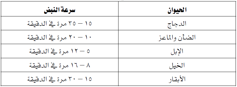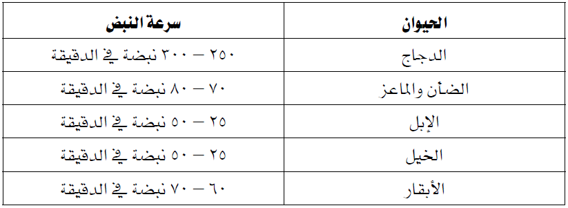 جدول (۲) سرعة النبض في الدواجن والحيوانات الكبيرة للمقارنة