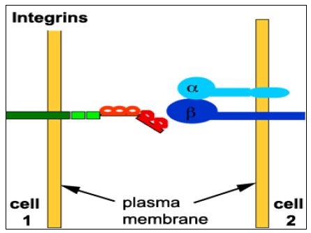 والبروتينات المختلفة ترتبط الى تركيب ثلاثي الببتيد مكون من الارجينين والكلايسين وحامض الاسبارتيك التي تؤدي الى تحفيز التصاق الخلايا مثل T cell لخلايا اخرى مثل Endothelial Cells او المواد خارج الخلايا مثل Fibronectin او Laminin الذي يؤدي الى اداء عمليات حيوية متعددة مختلفة مثل التئام الجروح والابتلاع وتوليد الاجنة ولها دور كبير في المناعة ونقل الاشارات