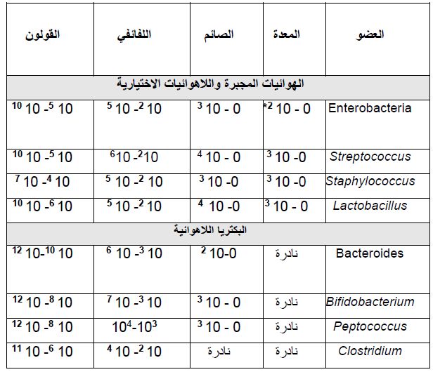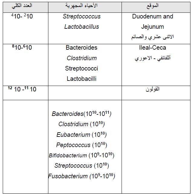 الأحياء المجهرية الموجودة في القناة الهضمية للإنسان والحيوانات وتعد أساسية لبقائها ، وأهم الأجزاء التي توجد فيها هي منطقة الأمعاء الغليظة ، حيث تقوم الأحياء بالعديد من الفعاليات الأيضية اذ تكون في منطقة قريبة من الطبقة المخاطية الطلائية او الظهارية Epithelial وتتفاعل هذه الأحياء مع المواد الغذائية الداخلة الى الجهاز الهضمي مؤدية أدوارا مختلفة ويظهر الجدول التالي بعض مجاميع البكتريا في القناة الهضمية للإنسان وأعدادها التقريبية .