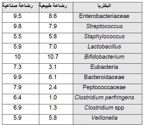 - طريقة التغذية فالرضاعة الطبيعية تشجع توافر الأحياء المفيدة ، أما ذوي الرضاعة الصناعية فتكون الفلورا لديهم مشابهة لما موجود في البالغين كما موضح في الجدول الآتي :