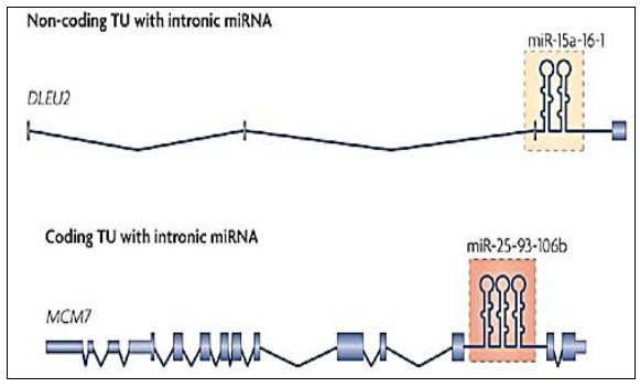 جزيئات RNA صغيرة غير مشفرة تنتسخ من الانترونات وتشارك في عمليات تنظيم التعبير الجيني خاصة الاسكات وحدوث الطفرات فيها يمكن ان تعطي جزيئات جديدة مؤثرة في التنظيم ولذلك تكون بمثابة قوة دافعة لعمليات التطور Evolution التي تحصل للأحياء . ومن الجدير بالذكر ان التواليات المسئولة عن miRNA تميل للتجمع والتعنقد Clustering في عناقيد منتشرة في الجينوم ، والبعض منها ينتسخ كوحدات متعددة الرسائل Polycistronic .