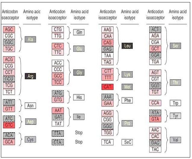 جزيئات مختلفة من tRNA التي ترتبط الى الشفرات البديلة للحامض الاميني نفسه الذي له اكثر من شفرة ، وهي تختلف بين الاحياء كما في الاتي :