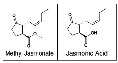 مركبات Jasmonic acid و Methyl Jasmonate التي توجد في النباتات كوسائل دفاعية تجاه الإصابات الحشرية والفطرية المرضية ويصنعها النبات من الحوامض الدهنية غير المشبعة مثل Linoleic acid وتتجمع في الأجزاء المتضررة اذ تقوم بتحفيز بعض الجينات المسئولة عن تخليق البروتينات الدفاعية وتحفز تجميع الدواحرالحيوية .
