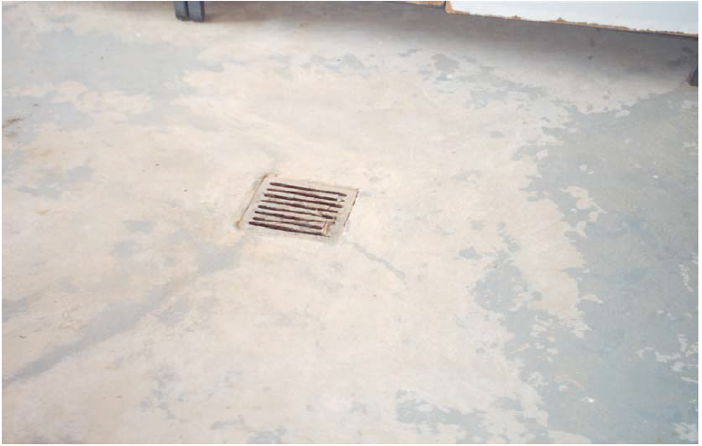 يجب أن تحتوي الأرضية على عدد كبير من فتحات التصريف ويكون الميلان جهة فتحات التصريف مناسبة لتسهيل تنظيف المبنى شكل رقم (6).