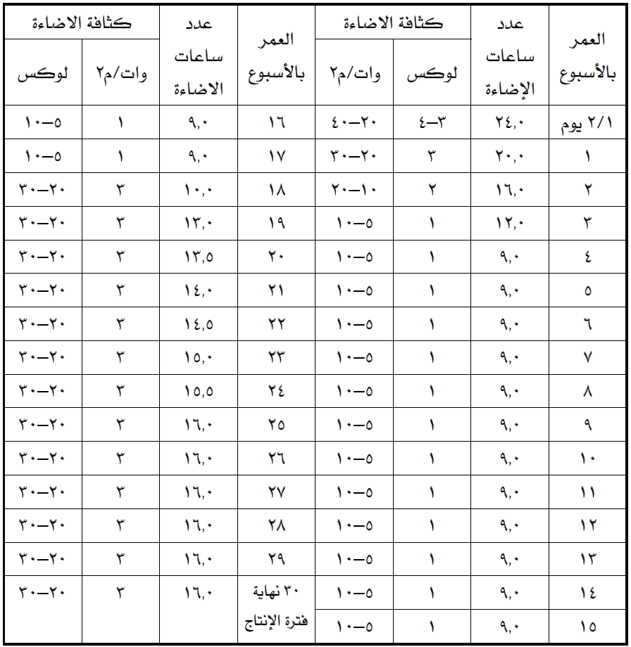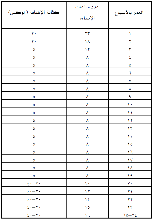 ۲. قد تبدأ بعض الفرخات في وضع البيض في عمر مبكر ولكنها لا تمثل حالة باقي القطيع ، ولا يعتبر القطيع قد بدأ في الإنتاج إلا بعد وصول معدل الإنتاج اليومي إلى ۱۰٪ على الأقل وحينئذ يعتبر الأسبوع الذي وصل إليه هذا الحد من الإنتاج هو الأسبوع الأول للإنتاج.