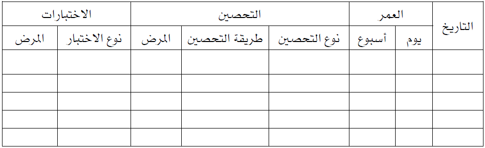جدول (5) نموذج لسجل برامج التحصين ومواعيد اختيارات الدم