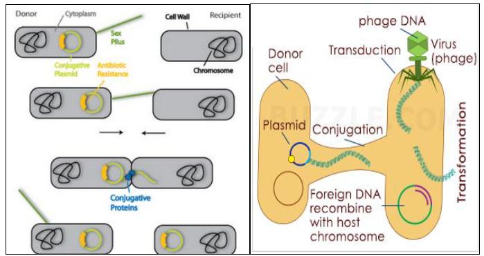 وعمليات تبادل المعلومات الوراثية في الخلايا بدائية النواة التي قد يستعار بعضها للاستعمال في الخلايا حقيقية النواة قد يؤدي الى إحلال أليل Allele او نسخة من الخلايا الواهبة مكان جين الخلايا المستلمة ، وتتم العمليات باحدى الطرق وهي التحول Transformation والتنبيغ Transduction والاقتران Conjugation .