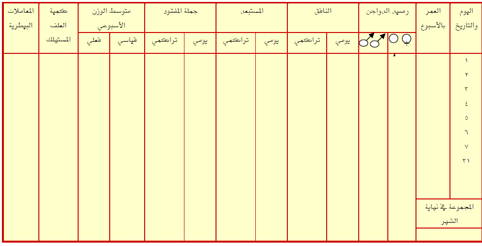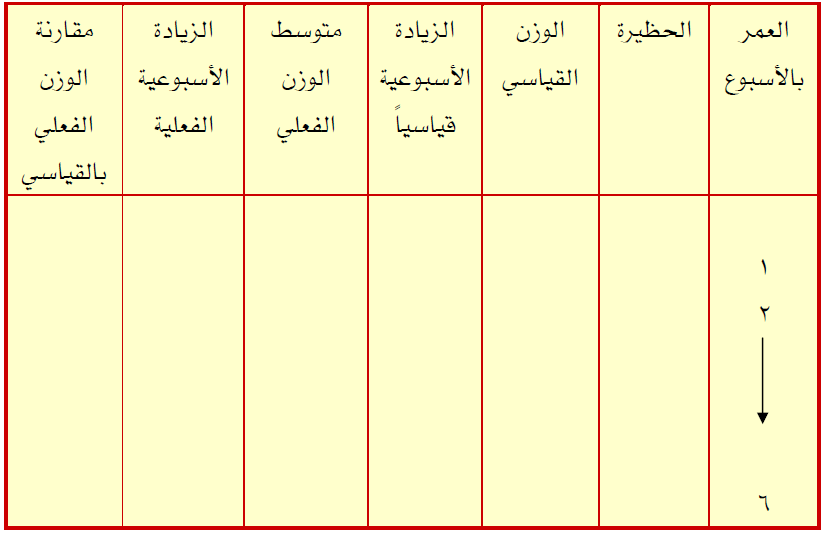 بالإضافة لما ذكر في فقرة (1) السجل العام. يحتوي سجل الأوزان الأسبوعية على بعض النقاط الخاصة بالوزن الأسبوعي. حيث يتم من خلاله المقارنة بين الأوزان السابقة والحالية والحصول على نتائج يمكن من خلالها حساب كمية أو معدل تحويل الغذاء للتأكد من سلامة الغذاء والقطيع والتنبؤ بالمشكلات إن وجدت ومعالجتها.