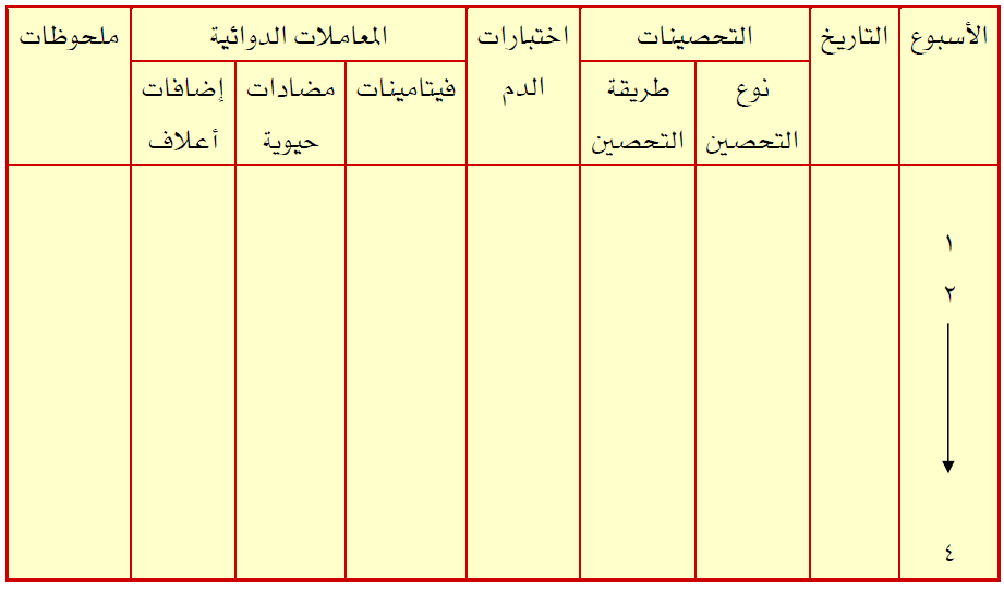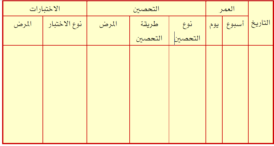 في هذا الجدول يدون نوع التحصين وطريقة التحصين ونتائج اختبارات الدم ، هذا بالإضافة إلى تدوين المعاملات الدوائية أسبوعيا ، وبذلك نحصل في نهاية فترة التربية على ملخص شامل لواقع الحالة البيطرية للقطيع حتى يستطيع المدير الفني للقطيع الاستفادة المستقبلية في إدارة القطعان التالية في المزرعة ( الحظائر).