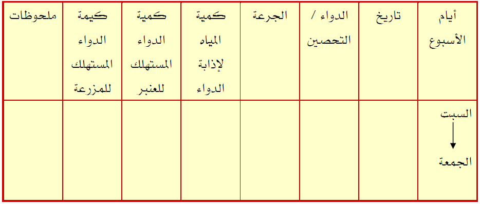 ويسجل فيه الدواء المقرر، وكذلك التحصينات المدرجة في برنامج التحصين المحدد في بداية الدورة ، وتسجل الأدوية يوميا بالجرعة المحددة للطائر ، والكمية المستهلكة للحظيرة ، وكذلك الكمية المستهلكة للمزرعة. ويسجل في هذا النموذج في بداية الأسبوع مع كتابة كمية المياه اللازمة لإذابة الدواء يوميا.