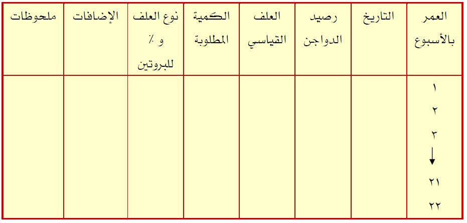 يتم من خلالها التأكد من المعدل القياسي لاستهلاك العلف للسلالة ومقارنته بالمعدل الواقعي خلال نفس الفترة. وكذلك يتم من خلال هذا السجل معرفة نوعية الإضافات الغذائية المطلوبة لكل أسبوع وكذلك معدل التحويل الغذائي الواقعي مقارنة بمعدل التحويل الغذائي القياسي للسلالة.