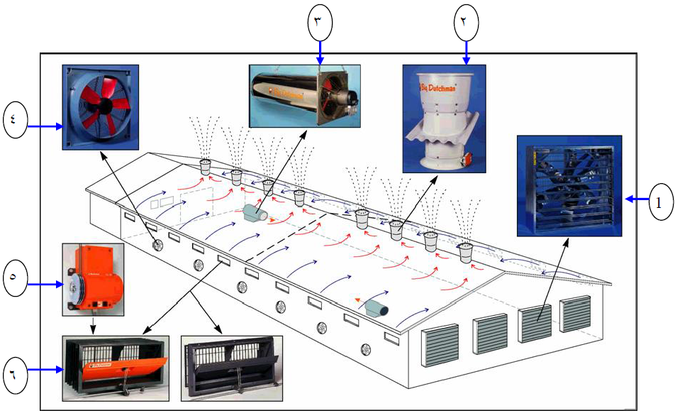 شكل يبين اماكن تثبيت اجهزة التدفئة المركزية وتوزيعها داخل الحظيرة مع المراوح وفتحات التهوية