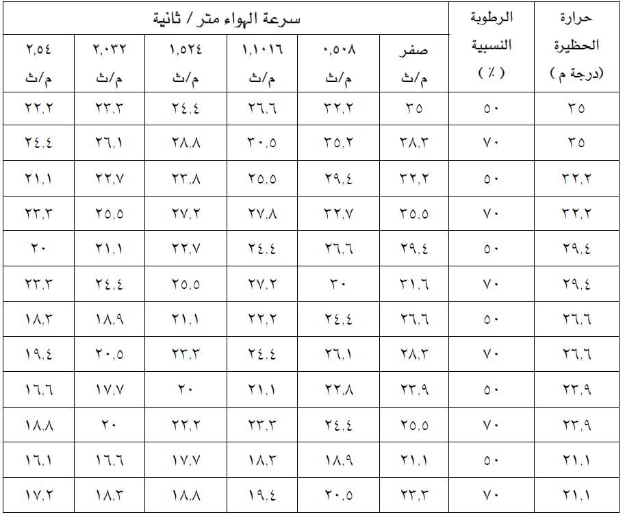 جدول يبين درجة الحرارة الفعالة الناتجة عن تأثير درجة حرارة الحظيرة والرطوبة النسبية وسرعة الهواء مجتمعة*