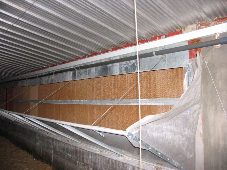 وفيه تركب ألواح من الورق السيليولوزي المتعدد الخلايا وتركب عليه ماسورة بها ثقوب لينزل منها الماء على الألواح، وهذا النظام يخفض درجات حرارة الهواء ۱۲ درجة مئوية، وهذا النوع من النظام يناسب التربية في الحظائر المغلقة.
