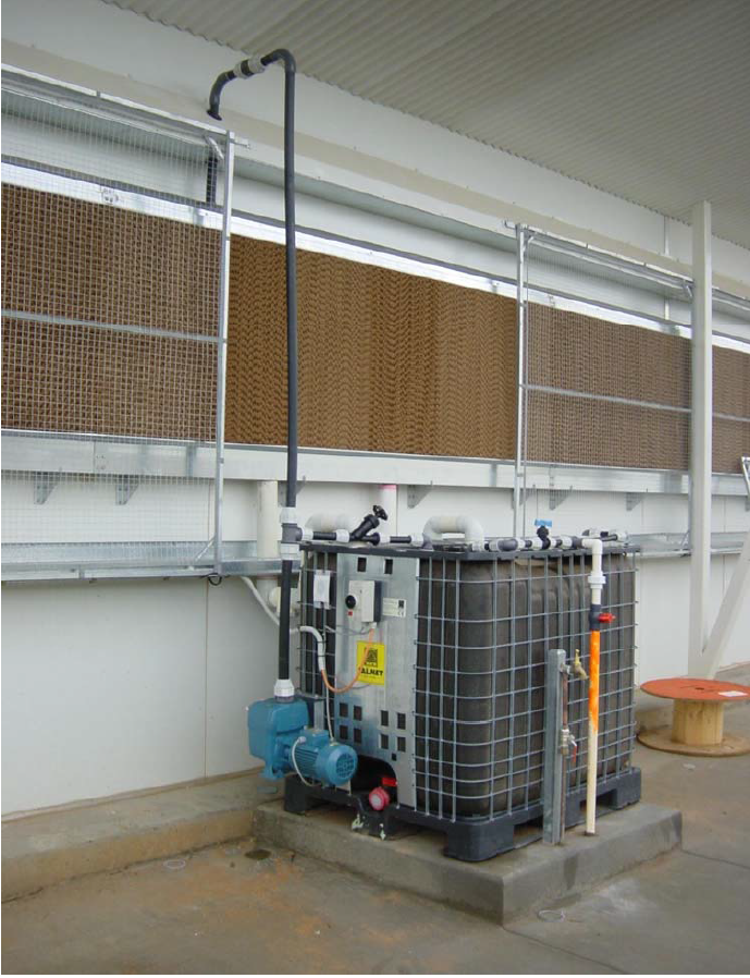 وهذا الجهاز يركب خارج الحظيرة ويتصل بالخط العمومي للمياه حيث توجه مواسير المياه إلى أول جزء في الجهاز وهو عبارة عن مرشح للمياه لسحب أي مواد تكون عالقة بالمياه، ثم تدخل المياه بعد ذلك إلى جهاز الضغط الذي يعمل بالموتور لرفع ضغط الماء إلى 40-۷۰ ضغط جوي وذلك إذا كان المستعمل هو نظام نفث ضباب الماء ( Fogger ) أو في حدود ۲-4 ضغط جوي إذا كان النظام المستعمل هو نظام الرشاشات ( Sprayer )، كما يتصل بالجهاز مفاتيح التشغيل سواء أوتوماتيكية أو يدوية وبيان المقياس ضغط الهواء.