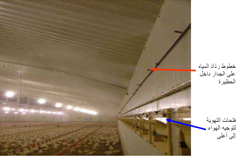 وفي هذا النظام تركب الرشاشات في الحظائر المغلقة داخل الحظيرة في صورة خطوط على أحد أجناب الحظيرة عند مداخل الهواء، سواء من الداخل شكل رقم (6)، أو من الخارج شكل رقم ( 7 )، وينتج عن ذلك تبريد للهواء الداخل بواسطة مرور الهواء الساخن على ذرات الماء الدقيقة ليبخرها ، ويفقد بذلك كمية الحرارة اللازمة لتبخر هذه المياه ، فيعمل على تبريد جو الحظيرة الداخلي ، وفي هذا النظام يمكن خفض حرارة الهواء ( 5-۷) درجة مئوية.