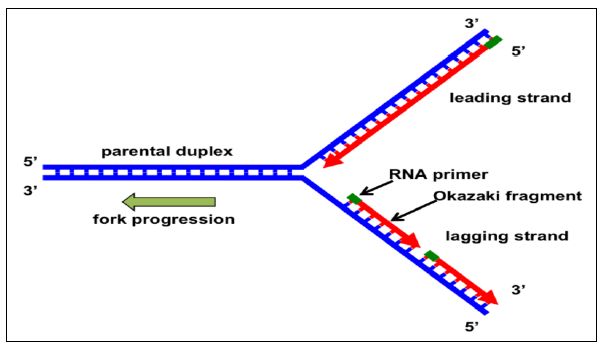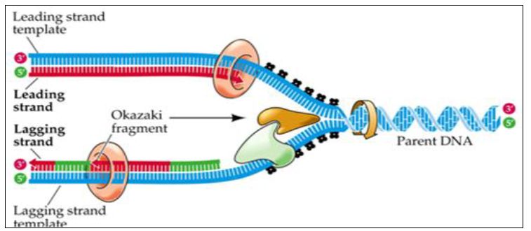 احد اشرطة DNA ويسمى ايضا الشريط الحساس الذي تتم مضاعفته بشكل مستمر باشتراك العديد من الانزيمات والبروتينات ويتضاعف بشكل مستمر باتجاه من ' 5 الى 3' بعملية كوثرة مستمرة