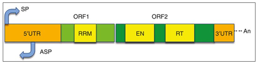احد انواع المكررات الموجودة في الجينوم البشري Long Interspersed Elements تتكرر حوالي 50,000 مرة في الجينوم وتشكل حوالي 0.5 % ، يوجد حوالي 3000 منها متكاملة الطول والباقي مبتورةخاصة عند النهاية 5′ . الكامل منها يصل طوله الى حوالي 6kb ويحوي اثنين من اطر القراءة المفتوحة ORFs احدها يشفر لانزيم النسخ العكسي Reverse Transcriptase ، اما النهاية 3′ فتكون غنية ب A-T ويحاط التوالي ب Short Direct Repeats