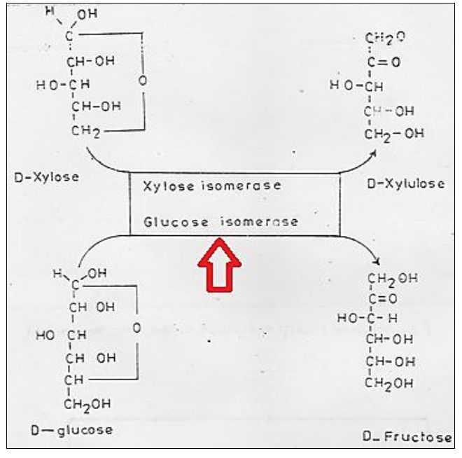 التسمية التجارية للأنزيم D – Glucose Ketoisomerase واختصاراً يسمى Glucose Isomerase ، والأنزيم يقوم بتحويل الكلوكوز إلى فركتوز ويمكن أن تنعكس التفاعلات تحت ظروف خاصة ، ومادة الأساس الأصلية للأنزيم هو الزايلوز اليمني الدوران. وفعالية الأنزيم على المواد الأساسية موضحة في الشكل الآتي :