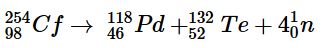 Once again, the number of nucleons is conserved. Thus the sum of the mass numbers of the products (118 + 132 + 4 = 254) equals the mass number of the reactant. Similarly, the sum of the atomic numbers of the products [46 + 52 + (4 × 0) = 98] is the same as the atomic number of the parent nuclide
