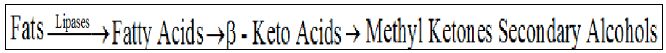 مركبات النكهة المهمة في الجبن والصيغة العامة لكيتونات المثيل 3 RCOCH والاختلاف في المجموعة R يمكن أن يؤدي إلى انتاج مركبات مختلفة النكهة . والسبورات الفطرية هي المسئولة عن الإنتاج فضلا عن المايسليوم ومن معوقات إنتاجها في الوقت الحاضر أن هذه المركبات تكون سامة للأحياء المنتجة لها عندما تتجمع بتراكيز عالية في الوسط الغذائي. ومنها 2 – Heptanone ، 2 – Nonanone ، 2 – Pentanone وغيرها ويمكن أن تنتج بعمليات تخمرية خاصة وتفصل وتستعمل في الأغذية وتنتج عادة مع الكحولات الثانوية من الدهون وفق الخطوات الآتية :