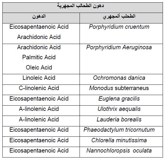 Sulphoquinouosyl Diglyceride , Monogalactosyl Diglyceride , Digalactosyl Diglyceride ,Lecithin Phosphatidyl Glycerol , Phosphatidyl Inositol والجدول التالي يوضح بعض الحوامض الدهنية المتوفرة في بعض دهون الطحالب المجهرية