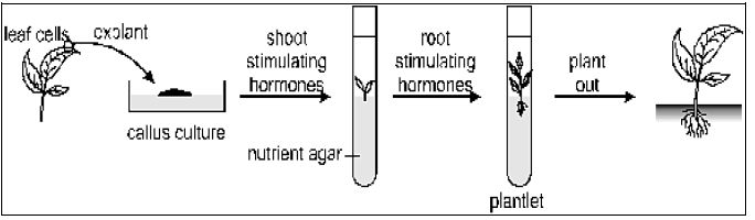 استعمال قطع صغيرة من الأنسجة القابلة للانقسام من الأحياء الكبيرة مثل الأنسجة المرستيمية في النباتات لتنميتها في مزارع خاصة لإنتاج عدد كبير من النباتات فيما بعد ، ويمكن تلخيص خطواتها بالمخطط الآتي :